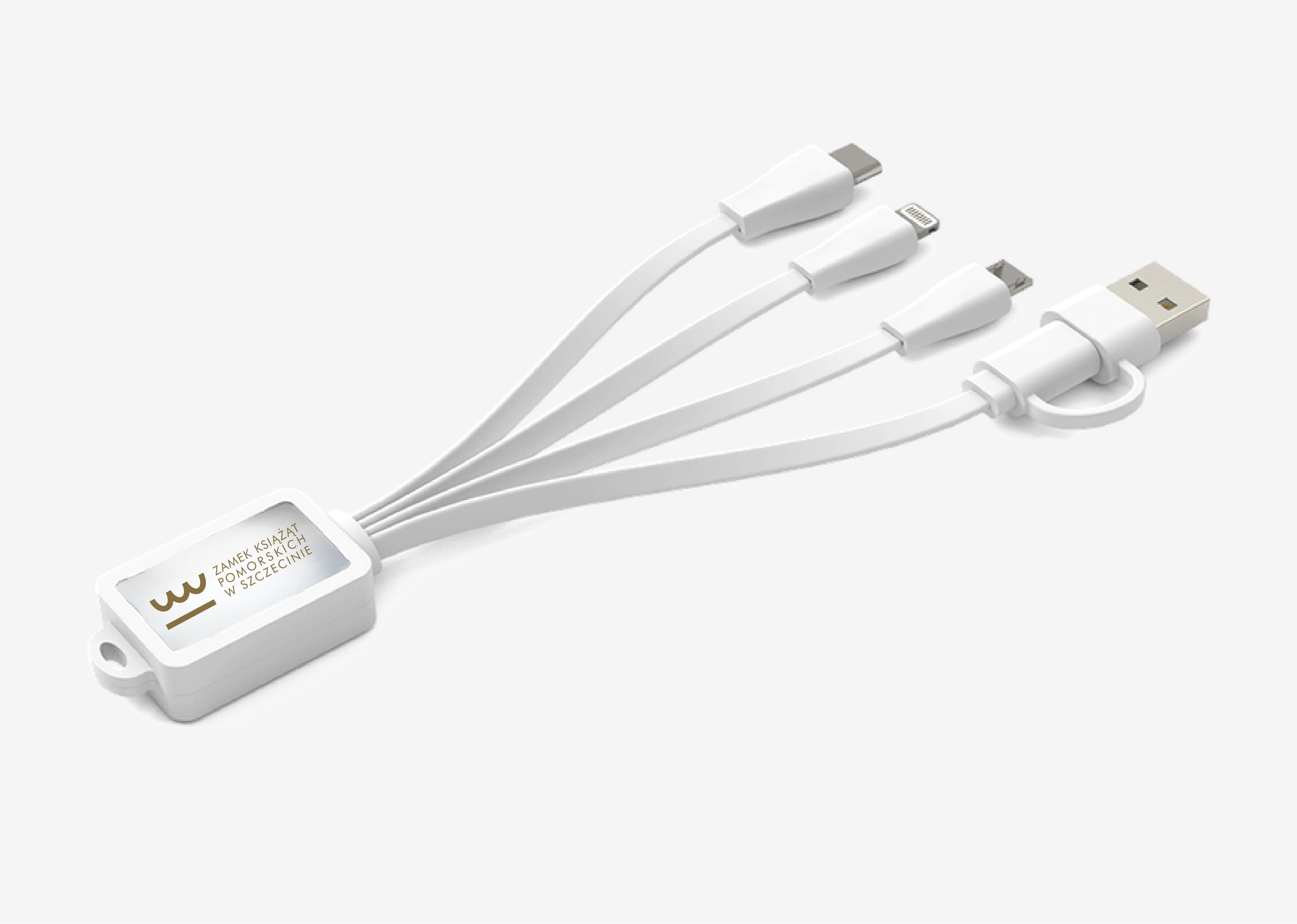 Kabel biały ze złotym logo Zamku Książąt Pomorskich w Szczecinie posiada konektory: standardowe USB, USB -C, Lightning i Micro USB.