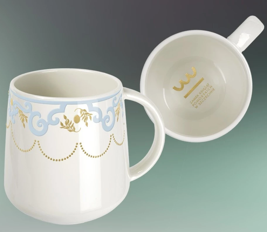 Nowoczesny kubek inspirowany Salą Bogusława X. To największa i najbardziej reprezentacyjna sala Zamku Książąt Pomorskich w Szczecinie, która pełniła niegdyś funkcję kościoła zamkowego. Powstała w XVI w. podczas przebudowy zamku na zlecenie księcia Jana Fryderyka przez włoskich mistrzów pod kierunkiem Wilhelma Zachariasza. W jej wnętrzu do dziś można podziwiać relikty średniowiecznego kościoła oraz fragmenty dawnych murów obronnych. Sklepienia zdobi neorenesansowa malatura, odtworzona na podstawie szkiców Paula Kutschmanna z 1909 roku.